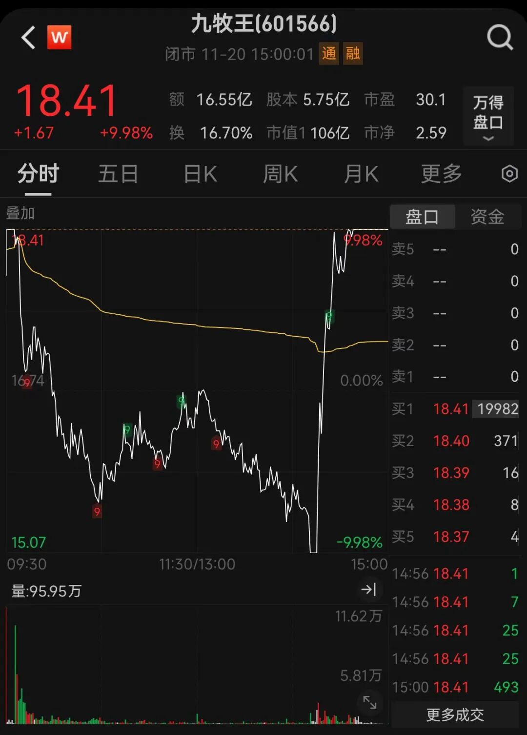 20日早间,已获“六连板”的九牧王开盘16秒就触及涨停,但未能稳住,股价迅速跳水,并于14时11分触及跌停。然而,在跌停板上停留不足5分钟后,股价又被强势拉回涨停,完整上演“天地天”行情。截至收盘,该股股价收涨9.98%,全天成交金额为16.55亿元,换手率为16.70%。