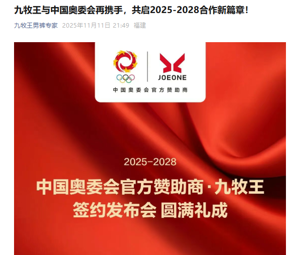 九牧王此轮暴涨行情始于11月12日。当日上午,其股价突然异动,直线拉升至涨停。市场普遍认为,这与前日晚间公司官宣成为“中国奥委会官方赞助商”的消息密切相关。